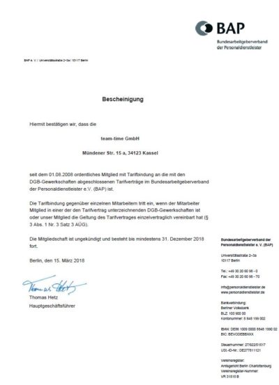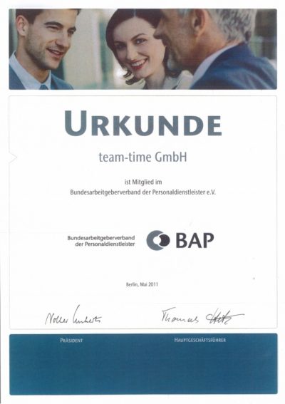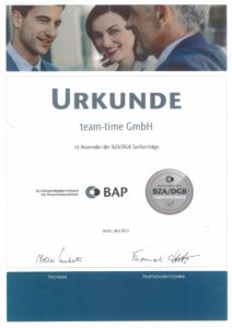 team-time ist Anwender der BZA/DGB Tarifverträge und Mitglied im Bundesarbeitgeberverband der Personaldienstleister e. V..